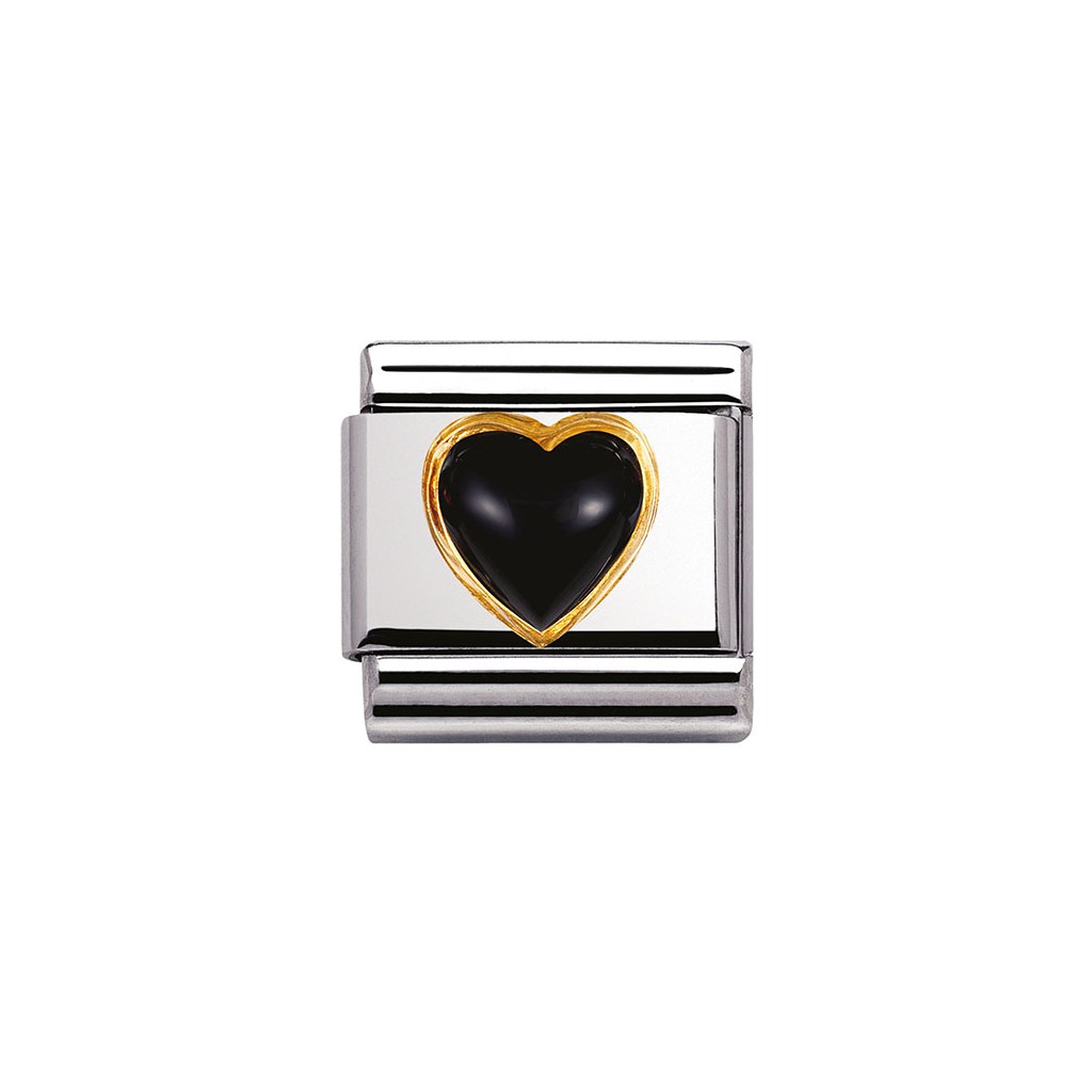 Moduł do klasycznej komponowanej bransoletki Nomination wykonany ze stali szlachetnej z sercem z czarnym agatem w oblamówce 18-karatowego złota.