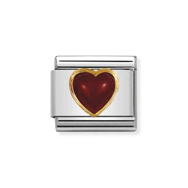 Moduł do klasycznej komponowanej bransoletki Nomination wykonany ze stali szlachetnej z sercem z bordowym agatem w oblamówce 18-karatowego złota.