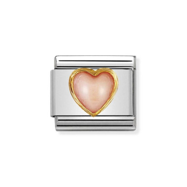 Moduł do klasycznej komponowanej bransoletki Nomination wykonany ze stali szlachetnej z sercem z różowego koralu w oblamówce 18-karatowego złota.