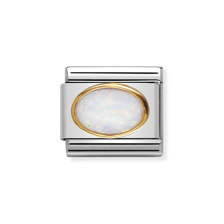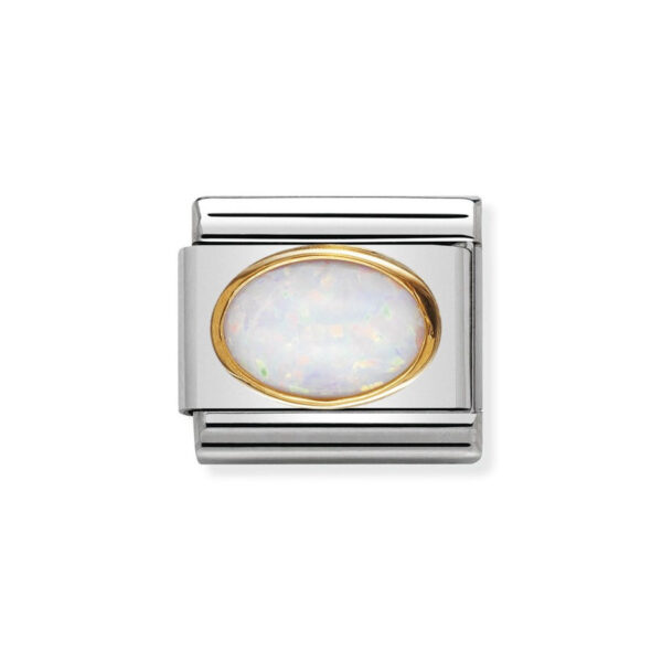Moduł do klasycznej komponowanej bransoletki Nomination wykonany ze stali szlachetnej z białym opalem w oblamówce 18-karatowego złota.