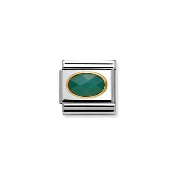 Moduł do klasycznej komponowanej bransoletki Nomination wykonany ze stali szlachetnej z fasetowanym zielonym agatem w oblamówce 18-karatowego złota.