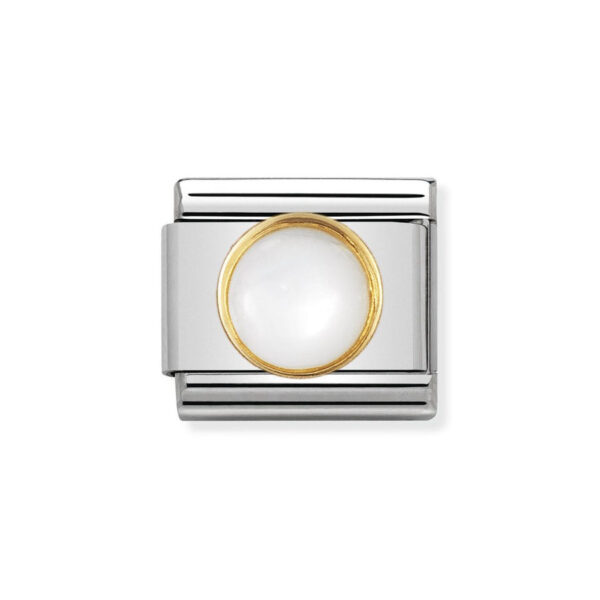 Moduł do klasycznej komponowanej bransoletki Nomination wykonany ze stali szlachetnej z okrągłą białą masą perłową w oblamówce 18-karatowego złota.