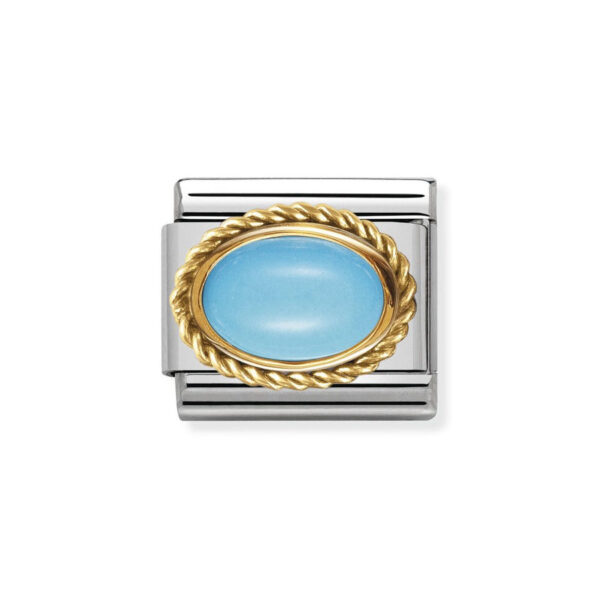 Moduł do klasycznej komponowanej bransoletki Nomination wykonany ze stali szlachetnej z turkusem w oblamówce z plecionki 18-karatowego złota.