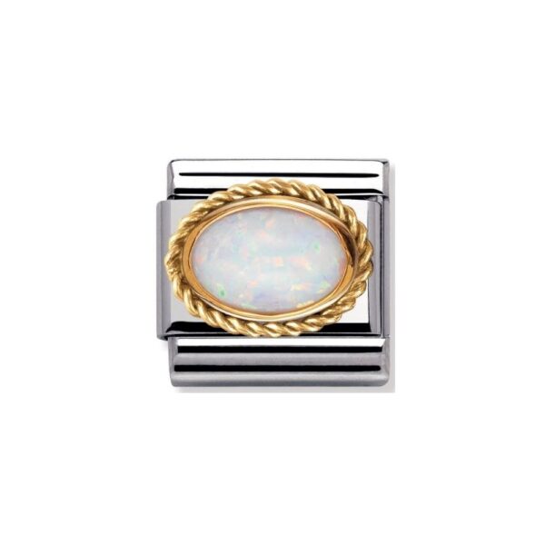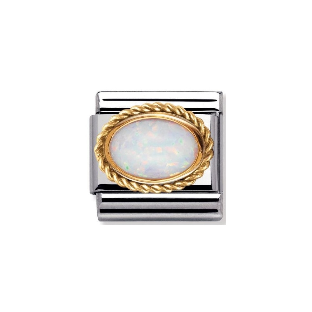 Moduł do klasycznej komponowanej bransoletki Nomination wykonany ze stali szlachetnej z białym opaleem w oblamówce z plecionki 18-karatowego złota.