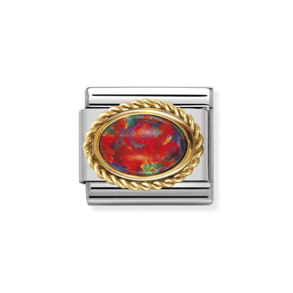 Moduł do klasycznej komponowanej bransoletki Nomination wykonany ze stali szlachetnej z czerwonym opalem w oblamówce z plecionki 18-karatowego złota.