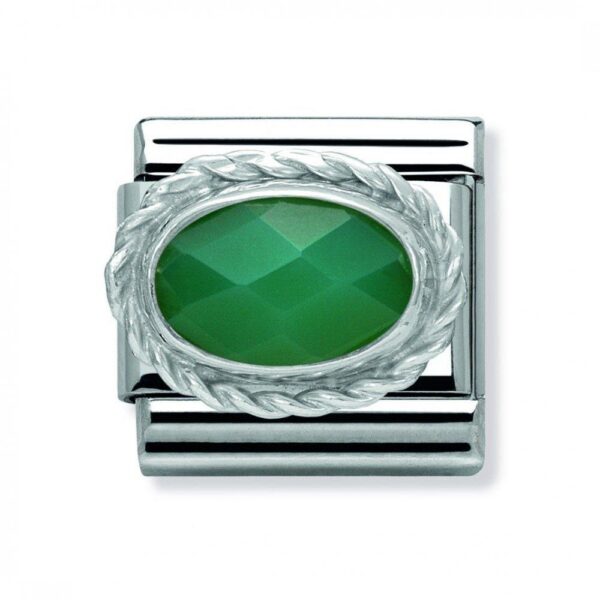 Moduł do klasycznej komponowanej bransoletki Nomination wykonany ze stali szlachetnej z fasetowanym zielonym agatem w oblamówce ze srebrnej plecionki.