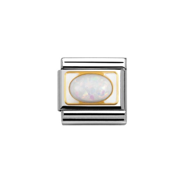 Moduł do klasycznej komponowanej bransoletki Nomination wykonany ze stali szlachetnej z białym opalem na białej emaliowanej płytce w oblamówce z 18-karatowego złota.