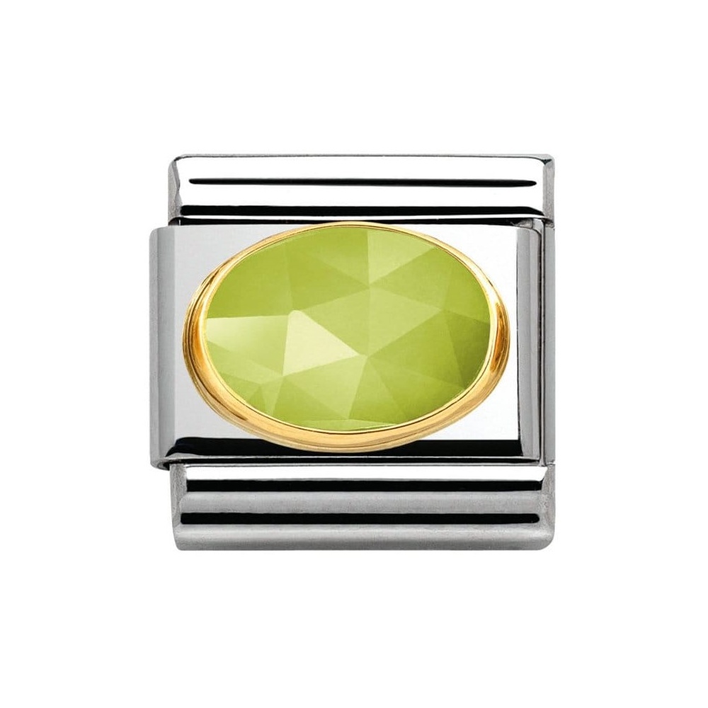 Moduł do klasycznej komponowanej bransoletki Nomination wykonany ze stali szlachetnej z jasnozielonym jadeitem w oblamówce 18-karatowego złota.