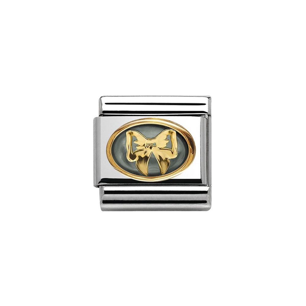 Moduł do klasycznej komponowanej bransoletki Nomination wykonany ze stali szlachetnej z kokardą w szarej masie perłowej w oblamówce 18-karatowego złota.