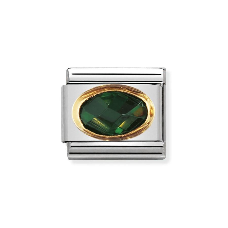 Moduł do klasycznej komponowanej bransoletki Nomination wykonany ze stali szlachetnej z zieloną fasetowaną cyrkonią w oblamówce 18-karatowego złota.