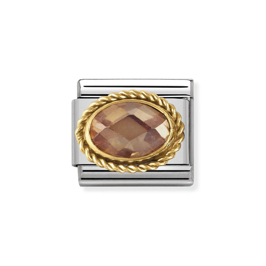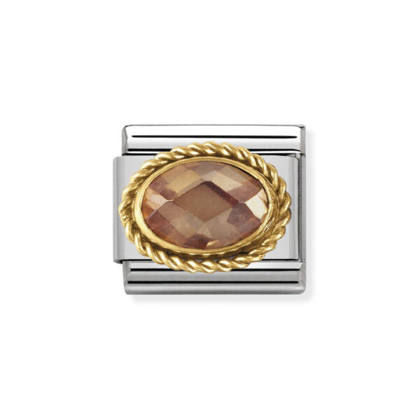 Moduł do klasycznej komponowanej bransoletki Nomination wykonany ze stali szlachetnej z szampańską cyrkonią w oblamówce z plecionki 18-karatowego złota.