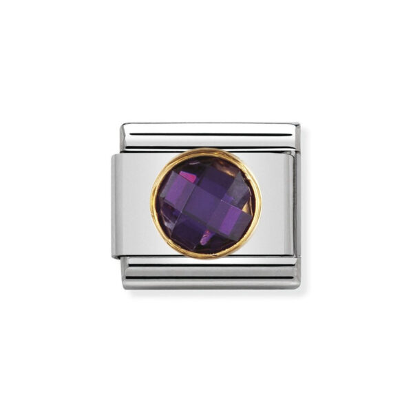 Moduł do klasycznej komponowanej bransoletki Nomination wykonany ze stali szlachetnej z okrągłą fioletową fasetowaną cyrkonią w oblamówce 18-karatowego złota.