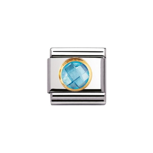 Moduł do klasycznej komponowanej bransoletki Nomination wykonany ze stali szlachetnej z okrągłą błękitną fasetowaną cyrkonią w oblamówce 18-karatowego złota.