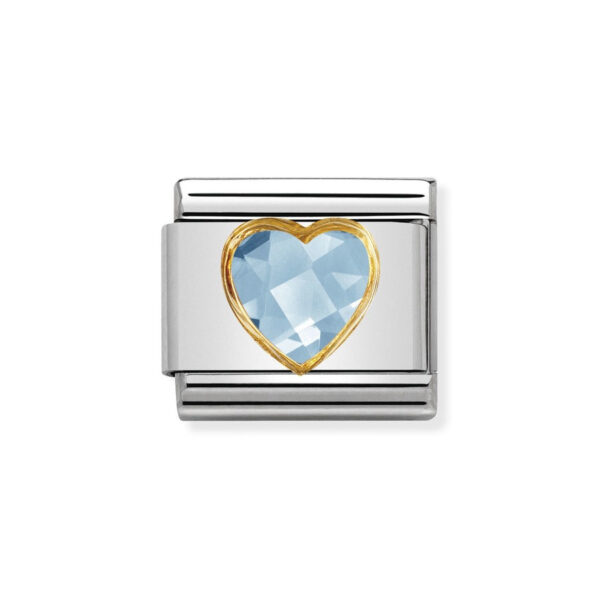 Moduł do klasycznej komponowanej bransoletki Nomination wykonany ze stali szlachetnej z błękitną fasetowaną cyrkonią o kształcie serca w oblamówce 18-karatowego złota.