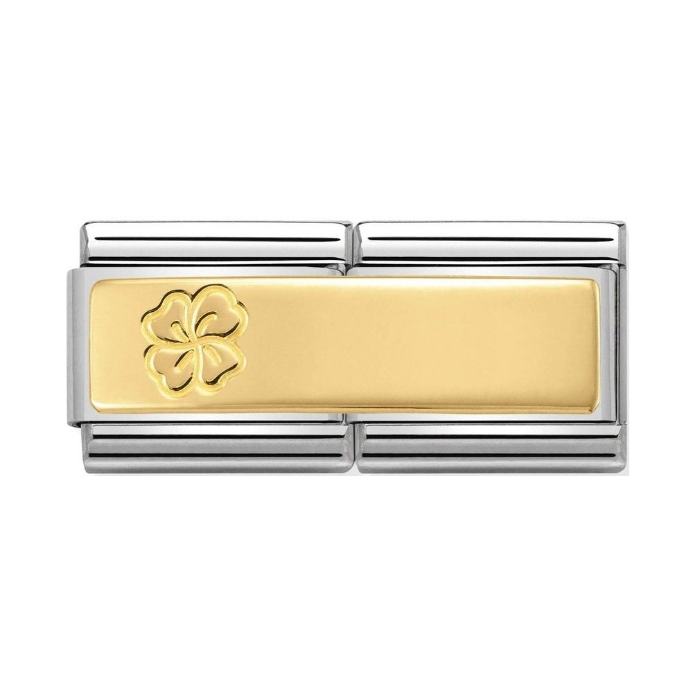 Podwójny moduł do klasycznej komponowanej bransoletki Nomination wykonany ze stali szlachetnej z wygrawerowaną koniczyną z 18-karatowego złota.