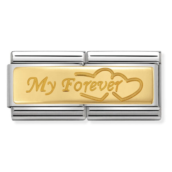 Podwójny moduł do klasycznej komponowanej bransoletki Nomination wykonany ze stali szlachetnej z wygrawerowanym napisem “My Forever” – mój na zawsze z 18-karatowego złota.