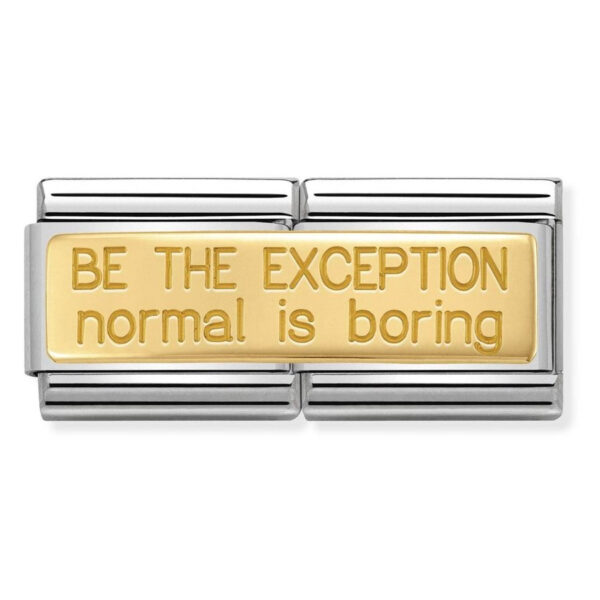 Podwójny moduł do klasycznej komponowanej bransoletki Nomination wykonany ze stali szlachetnej z wygrawerowanym napisem “BE THE EXCEPTION normal is boring” – BĄDŹ WYJĄTKIEM normalność jest nudna z 18-karatowego złota.