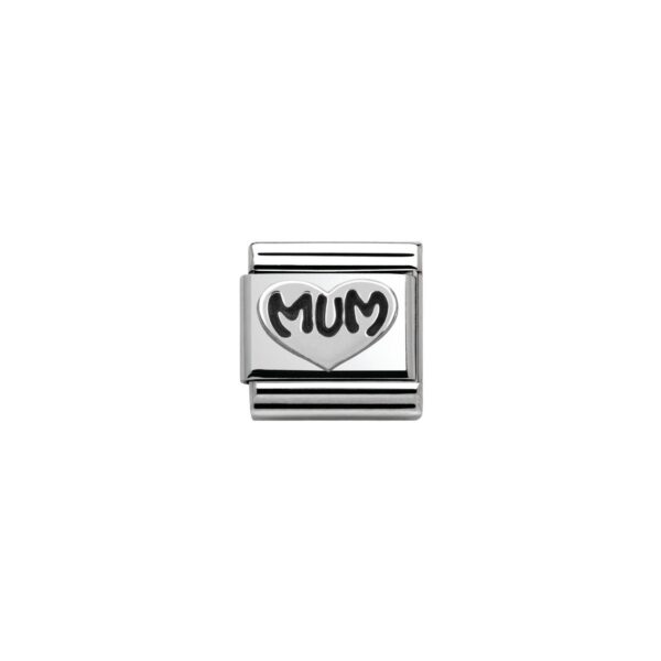 Oryginalny moduł do bransoletki komponowanej Nomination Composable Classic ze stali szlachetnej z serduszkiem i emaliowanym napisem “Mum” (“Mama”) ze srebra pr. 925.