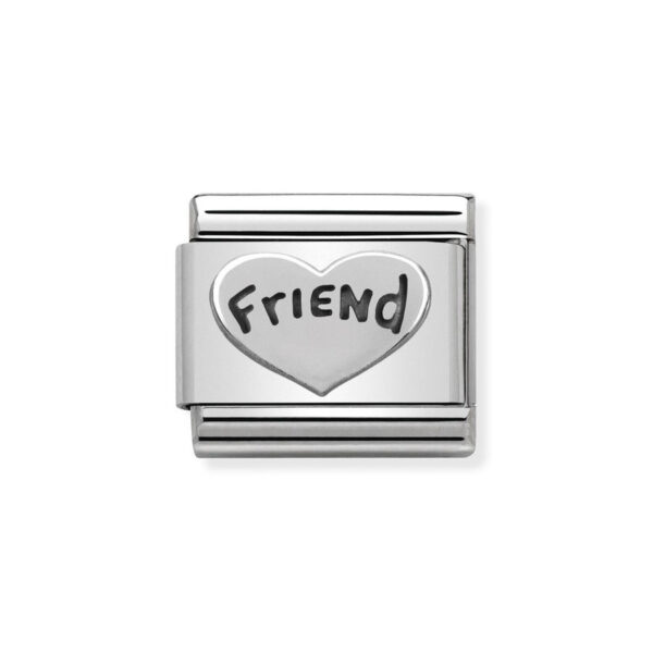 Oryginalny moduł do bransoletki komponowanej Nomination Composable Classic ze stali szlachetnej z sercem i napisem “FRIEND” ze srebra pr. 925.