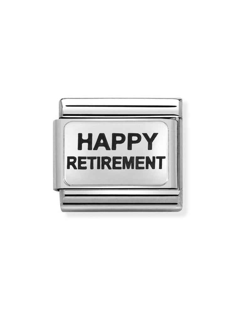 Oryginalny moduł do bransoletki komponowanej Nomination Composable Classic ze stali szlachetnej z napisem “HAPPY RETIREMENT” ze srebra pr. 925.