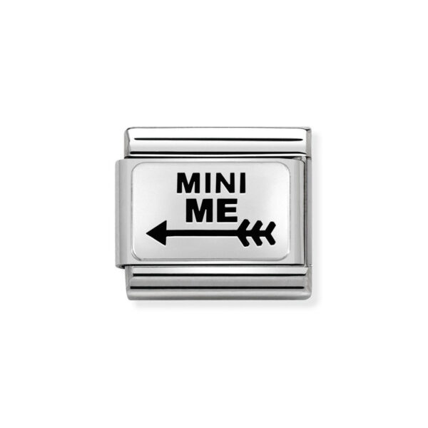 Oryginalny moduł do bransoletki komponowanej Nomination Composable Classic ze stali szlachetnej z napisem MINI ME i strzałą ze srebra pr. 925.