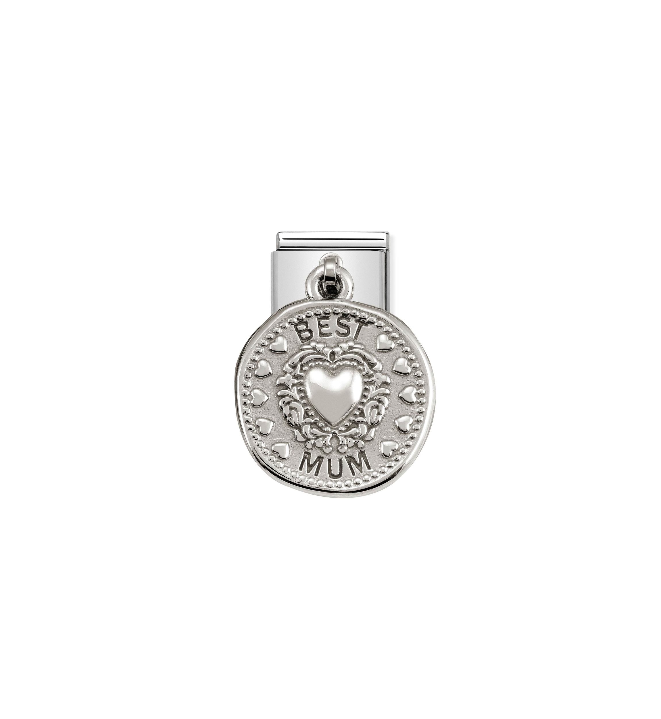 Oryginalny element do bransoletki komponowanej Nomination Composable Classic ze stali szlachetnej z zawieszką Serce z napisem ‘best mum’- najlepsza mama, wykonaną ze srebra pr. 925. Element ozdobny znajduje się na obu stronach zawieszki.
