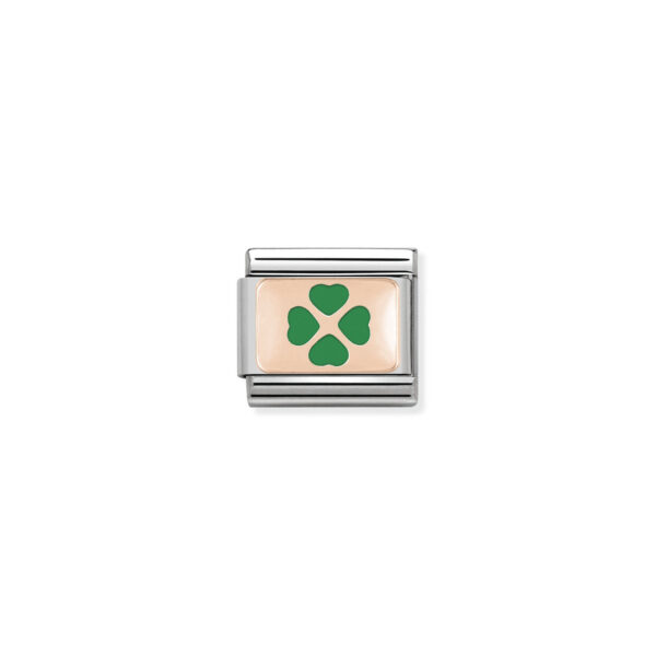 Oryginalny element wymienny do klasycznej komponowanej bransoletki Nomination wykonany ze stali szlachetnej z symbolem czterolistnej koniczyny z 9-karatowego różowego złota i emalii w kolorze zielonym.