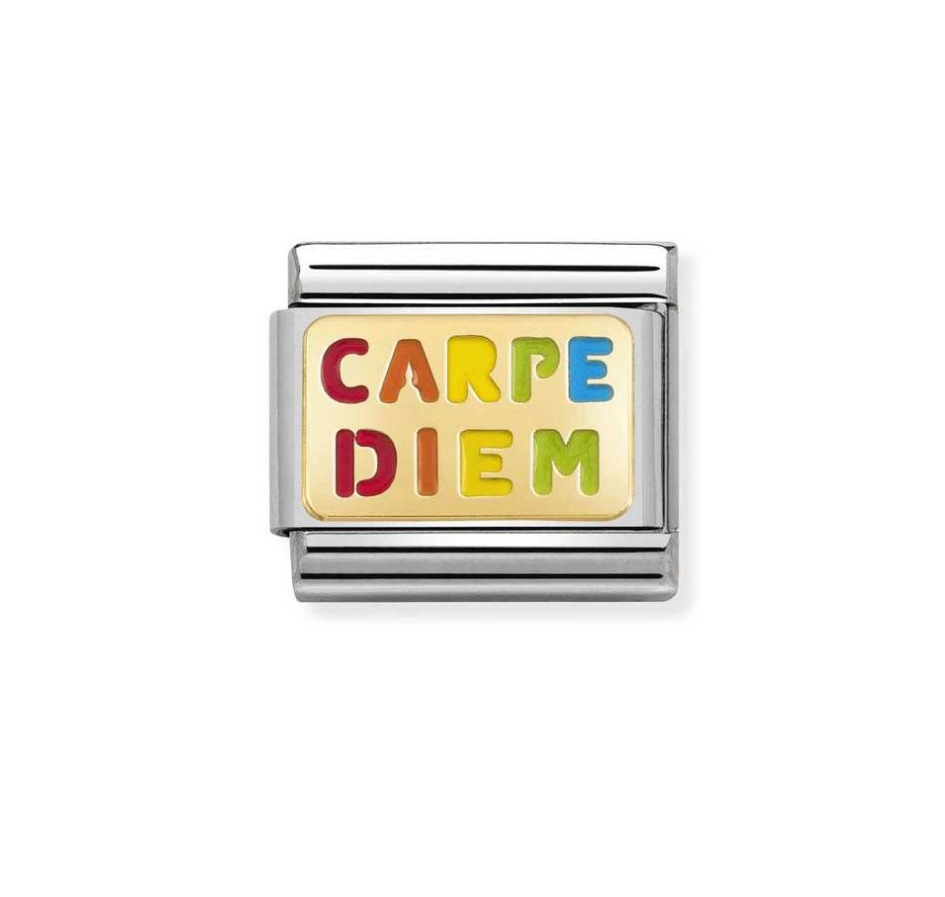 Element do bransoletki komponowanej Nomination Italy. Element wykonany ze stali szlachetej, 18-karatowego złota i wielokolorowej emalii, zdobiony napisem CARPE DIEM – chwytaj dzień. Ten link oddaje ducha przygody: Chwytaj dzień – masz tylko jedno życie!