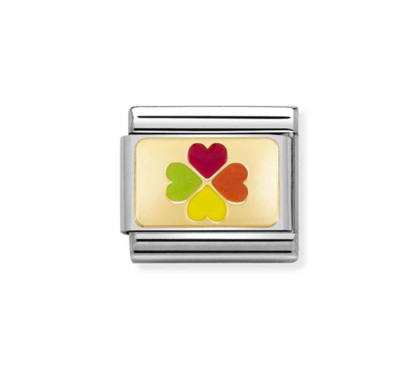 Element do bransoletki komponowanej Nomination Italy. Element wykonany ze stali szlachetej, 18-karatowego złota i wielokolorowej emalii, zdobiony motywem koniczynki. Ten link to prawdopodobnie najbardziej kolorowy sposób, aby przywołać więcej szczęścia!
