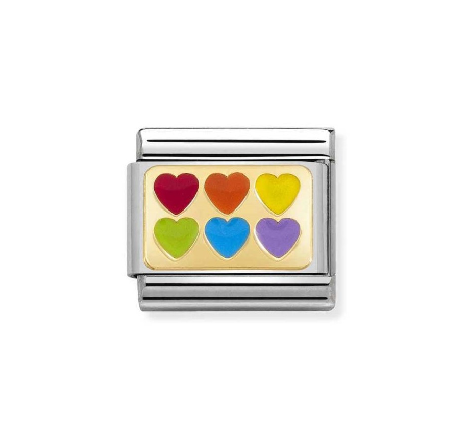 Element do bransoletki komponowanej Nomination Italy. Element wykonany ze stali szlachetej, 18-karatowego złota i wielokolorowej emalii, zdobiony motywem serduszek. Piękny i zabawny link, zawiera nie tylko 1, ale 6 kolorowych serc, które pomogą Ci policzyć wszystkie wyjątkowe osoby w Twoim życiu.