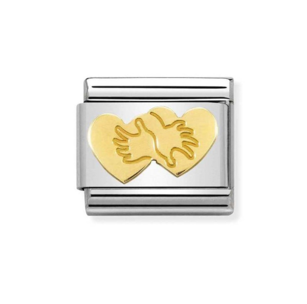 Element do bransoletki komponowanej Nomination Italy. Element wykonany ze stali szlachetej i 18-karatowego złota, zdobiony symbolem przytulających się serc. Wyprodukowany we Włoszech. Idealny element aby powiedzieć, że możemy być daleko od siebie, ale pozostać razem w naszych sercach!