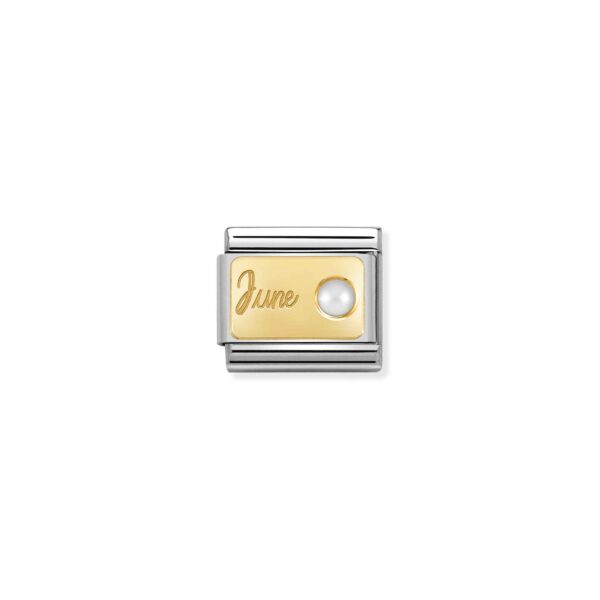 Oryginalny moduł do bransoletki komponowanej Nomination Composable Classic ze stali szlachetnej z blaszką z 18-karatowego złota i wygrawerowanym napisem “June” co oznacza miesiąc czerwiec i przypisany kamień – perła.