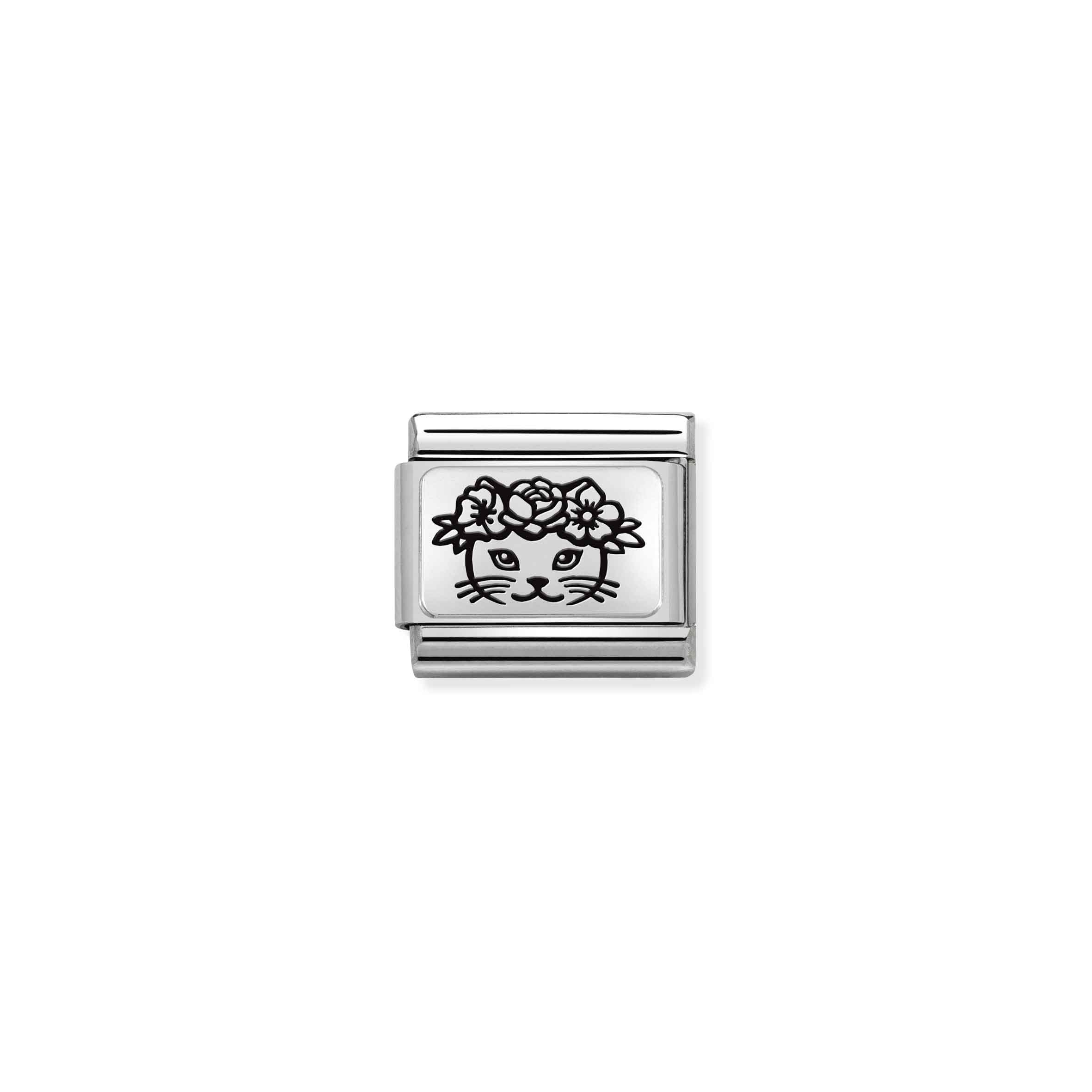 Oryginalny moduł do bransoletki komponowanej Nomination Composable Classic ze stali szlachetnej z blaszką ze srebra 925 i wygrawerowanym kotem oraz kwiatami.
