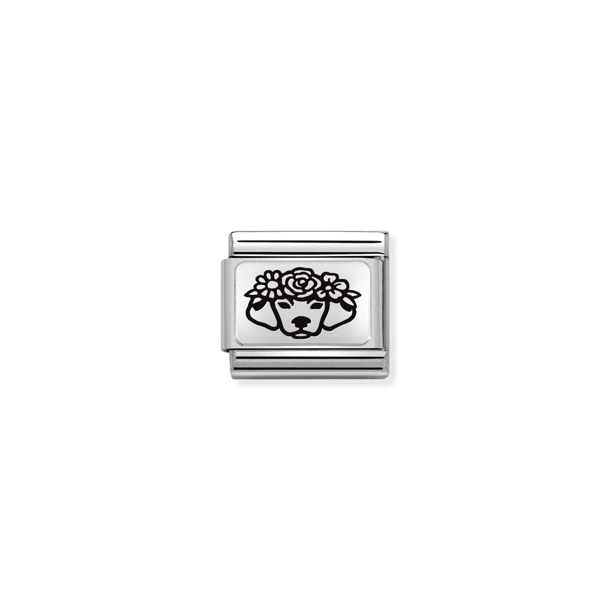 Oryginalny moduł do bransoletki komponowanej Nomination Composable Classic ze stali szlachetnej z blaszką ze srebra 925 i wygrawerowanym psem oraz kwiatami.