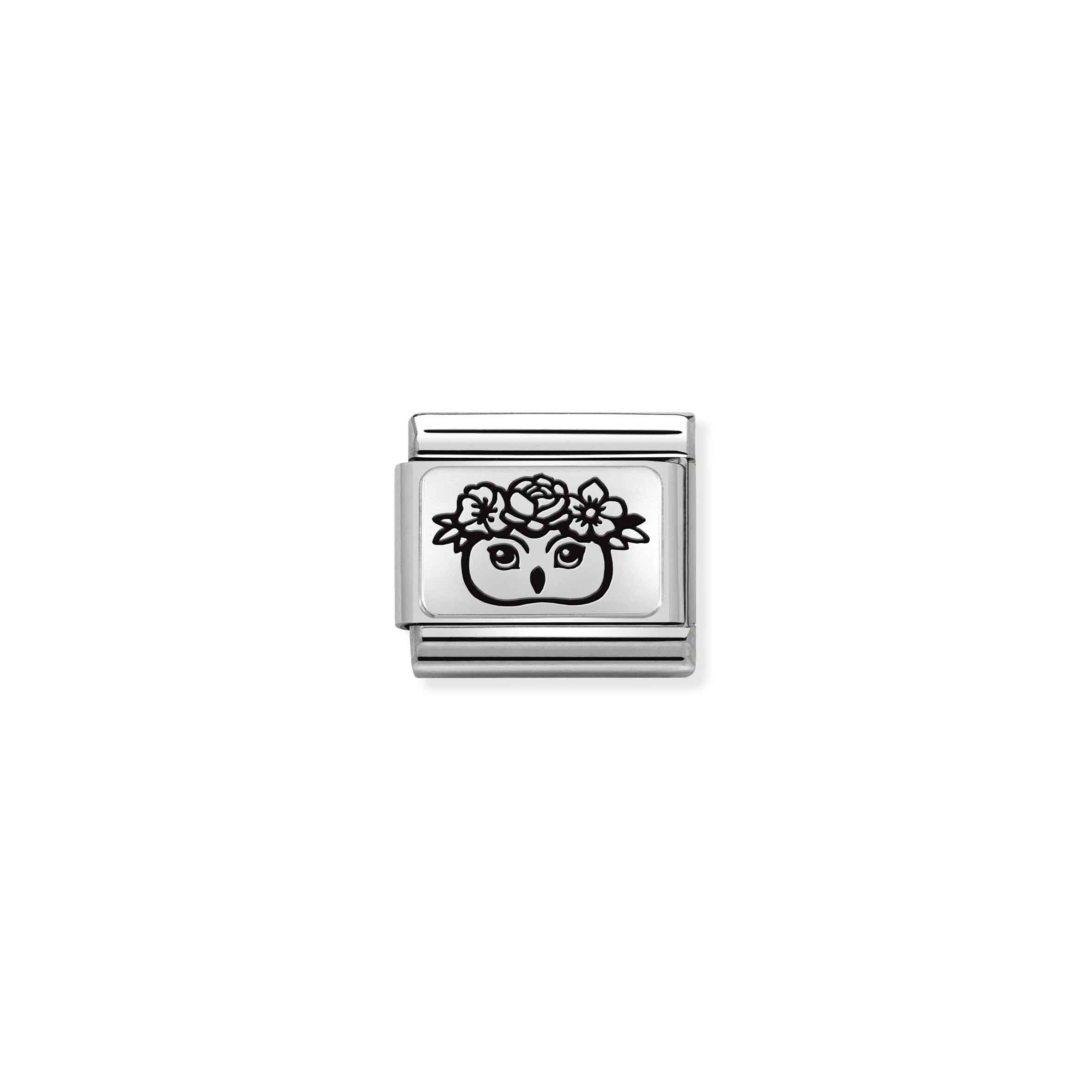Oryginalny moduł do bransoletki komponowanej Nomination Composable Classic ze stali szlachetnej z blaszką ze srebra 925 i wygrawerowaną sową z kwiatami.