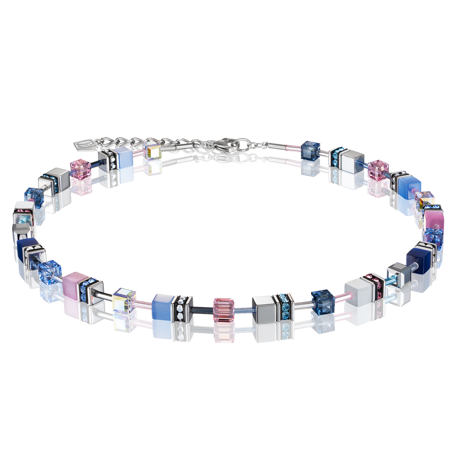 Naszyjnik z kolekcji GeoCUBE. Pełne wdzięku połączenie hematytu wykończonego tlenkiem tytanu, syntetycznego oka tygrysa, kryształów Swarovski® Crystals oraz kryształu górskiego ze stalą szlachetną pokrywaną srebrem. Zapięcie wykonane jest ze stali szlachetnej.