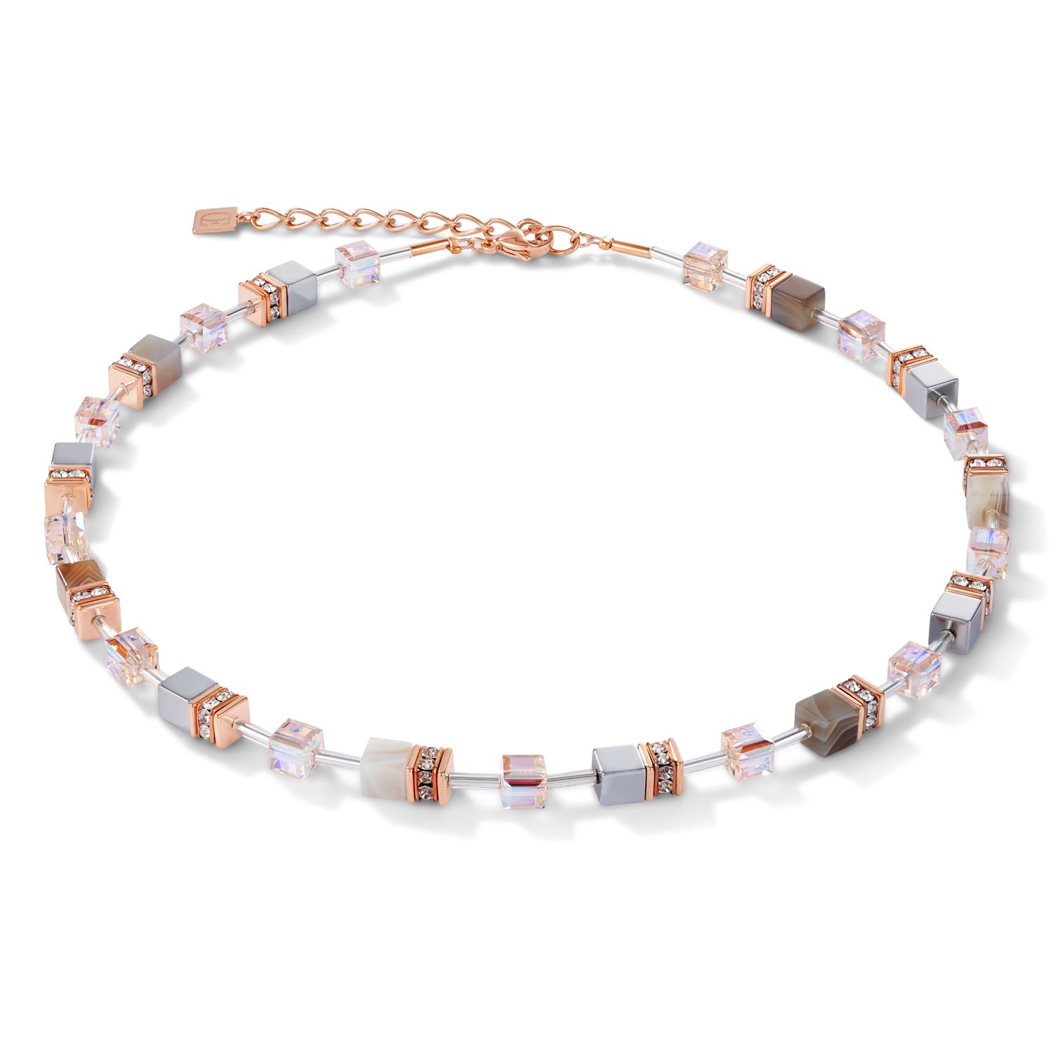 Do każdego stroju na każdą okazję: dopasowany naszyjnik z kolekcji GeoCUBE. Z agatem bostwany, hematytem wykończonym tlenkiem tytanu w połączeniu z kryształkami rhinestone, oraz z kryształami Swarovski® Crystals, i stalą szlachetną pokrywaną różowym złotem. Pełne wdzięku filigranowe połączenia z delikatnymi szklanymi elementami. Zapięcie wykonane jest ze stali szlachetnej 316L pokrywanej różowym złotem.