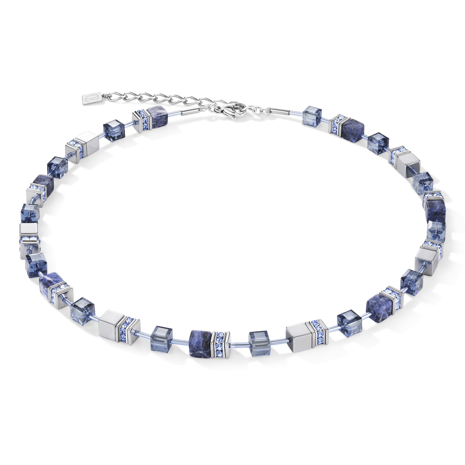 Ręcznie wykończony naszyjnik, zdobiony naturalnym sodalitem i hematytem o tytanowym wykończeniu, w połączeniu z kryształami Swarovski® Crystals i stalą szlachetną. Pełne wdzięku filigranowe połączenia z delikatnymi szklanymi elementami. Zapięcie wykonane ze stali szlachetnej.