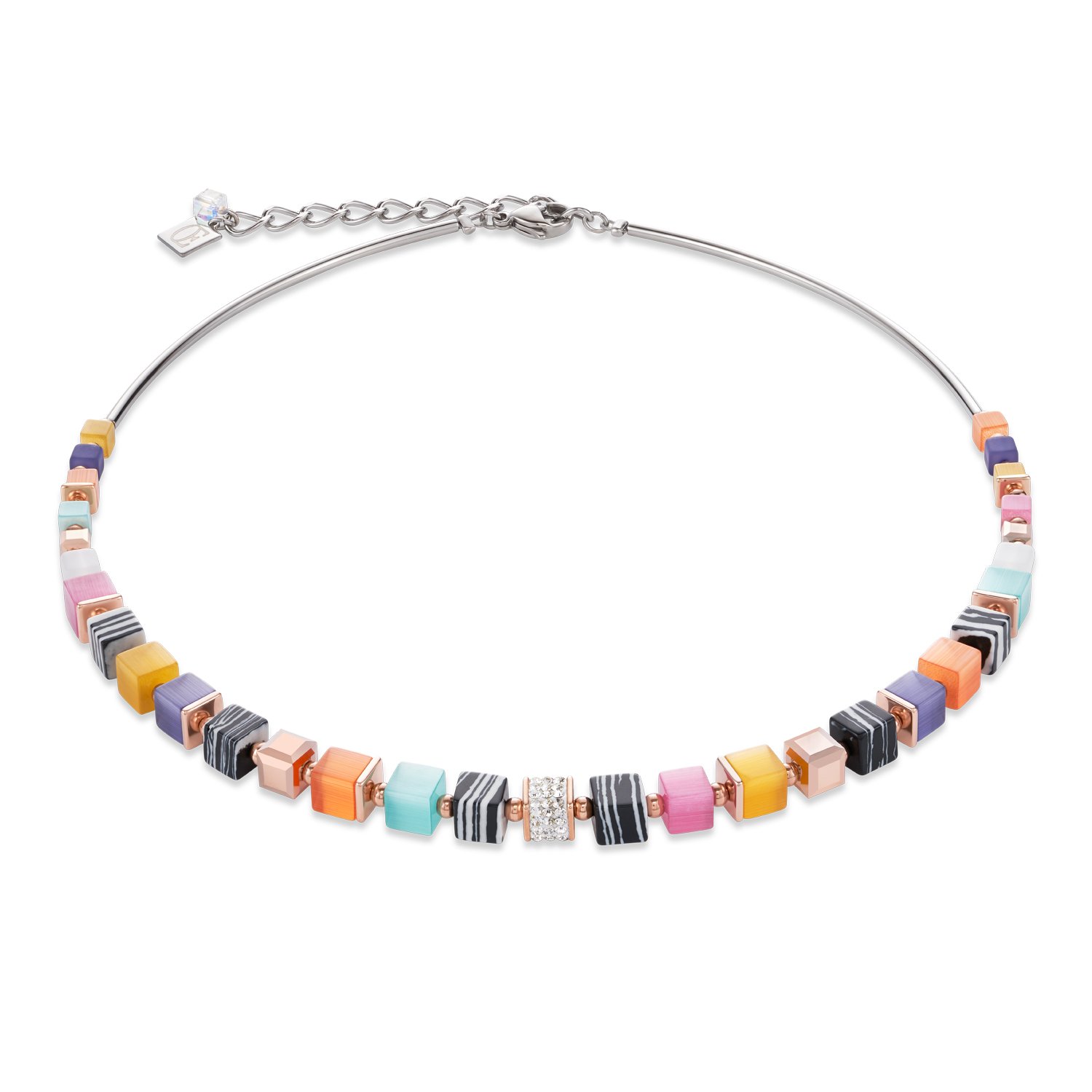 Elegancki naszyjnik z ekscytującą kompozycją pięknych kolorów i materiałów. Kryształy Swarovski®, kryształy pavé, syntetyczne oko tygrysa, syntetyczny malachit, różowe złoto ze stali nierdzewnej