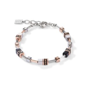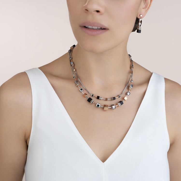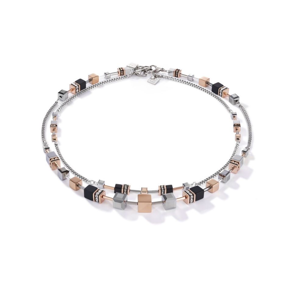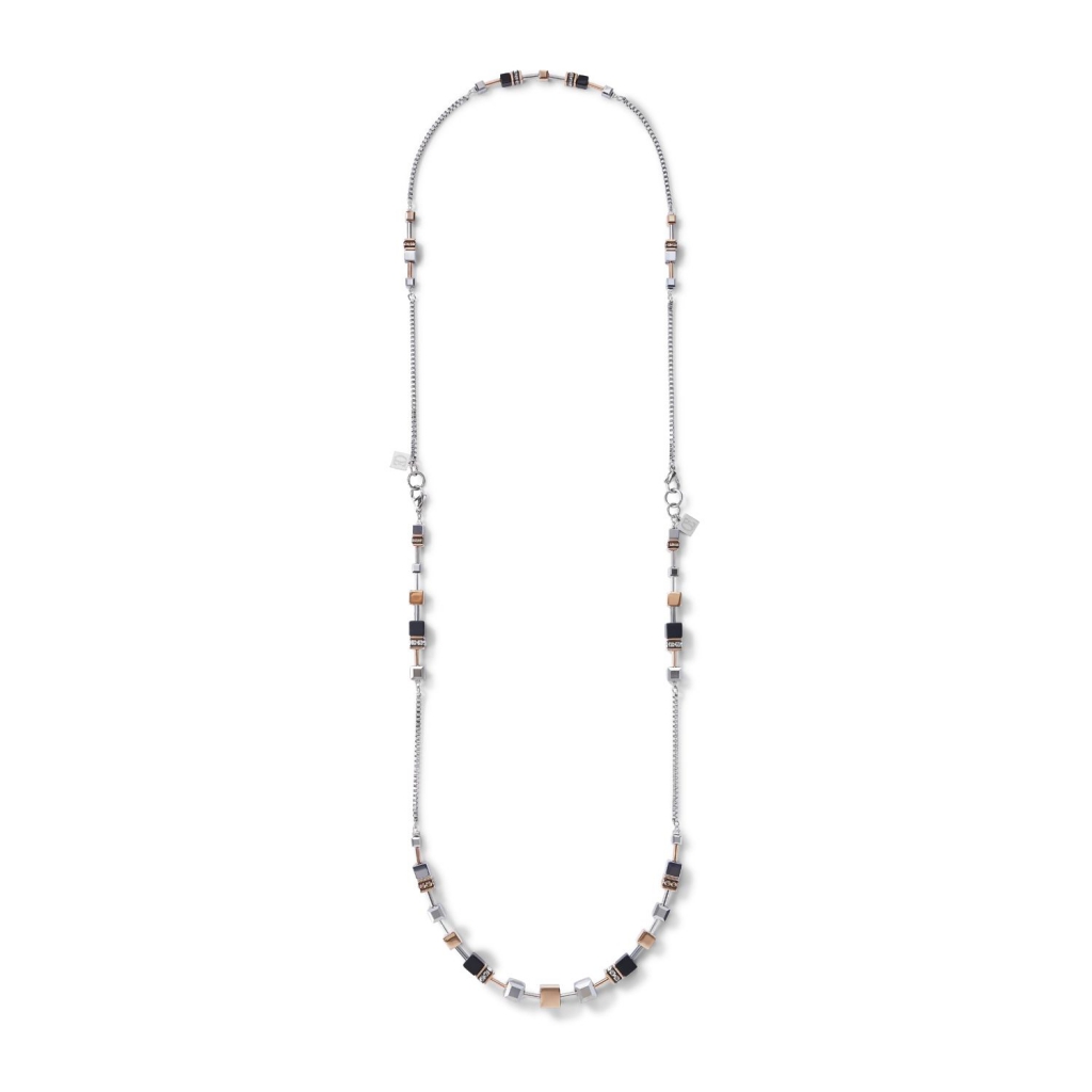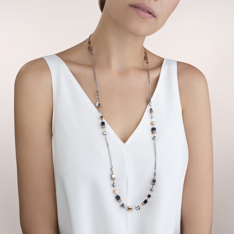 Wielofunkcyjny, powściągliwy i dyskretny, a zarazem elegancki. Długi i wyrazisty naszyjnik z kolekcji GeoCUBE® jako niedbale długi lub jako wyrazisty element – ten model oferuje cztery opcje noszenia. Można łączyć go w dwurzędowy naszyjnik lub nosić pojedynczo lub jako jeden długi naszyjnik. Ręcznie wykończony, z hematytem wykończonym tlenkiem tytanu, onyksem w połączeniu z kryształem górskim, kryształami Swarovski® Crystals oraz stalą szlachetną pokrywaną różowym złotem. Zapięcie wykonane jest ze stali szlachetnej pokrywanej różowym złotem.