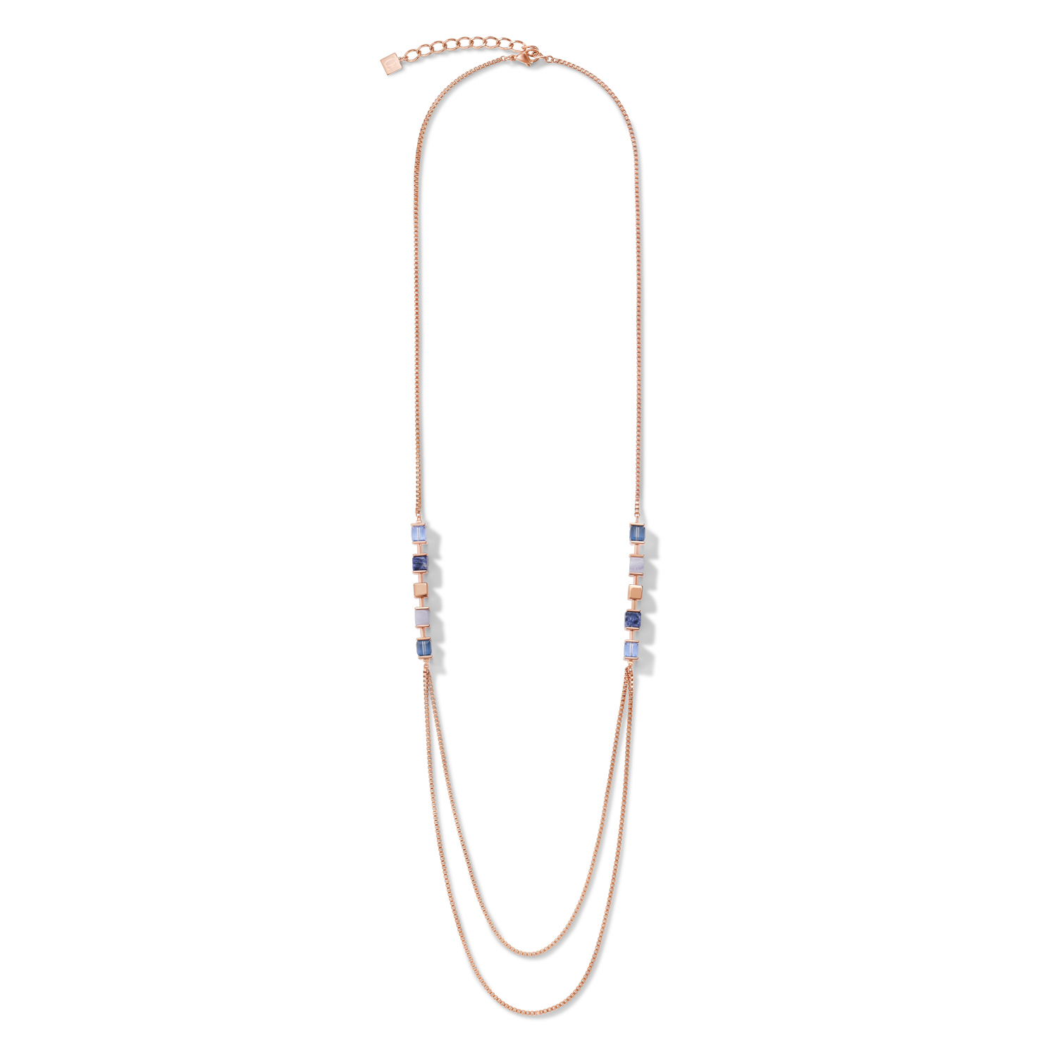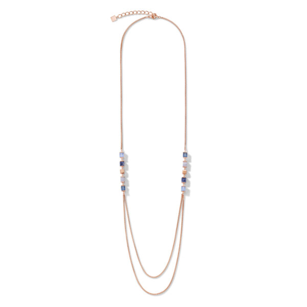 Piękno, które rozgrzeje Twoje serce: wyrafinowany naszyjnik z kolekcji GeoCUBE® z prawdziwymi kamieniami, takimi jak granatowy sodalit i jasnoniebieski chalcedon. Szczególnie elegancki wygląd w połączeniu z pasującym krótkim naszyjnikiem.