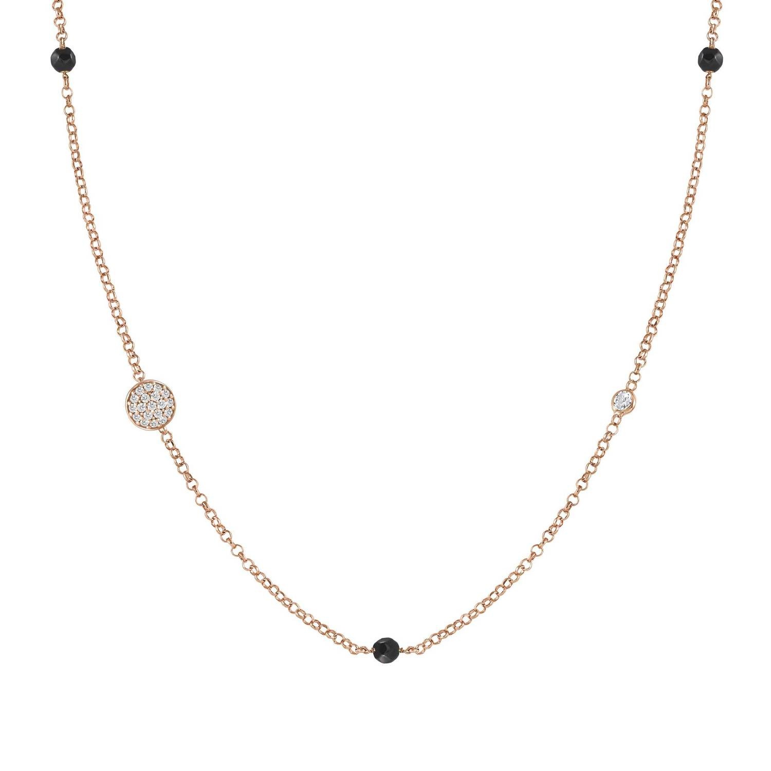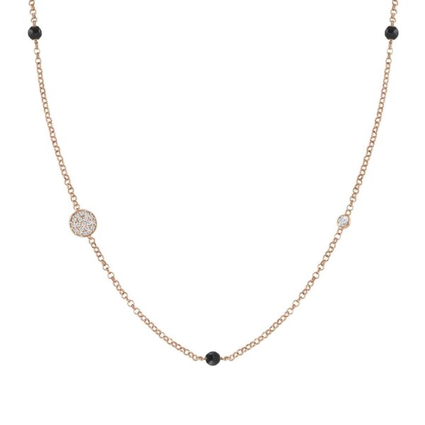 Oryginalny naszyjnik renomowanej firmy Nomination, wykonany ze srebra próby 925,pokryty 22k różowym złotem. Łańcuszek z drobnymi ogniwkami zdobiony czarnymi jadeitami oraz cyrkoniami.