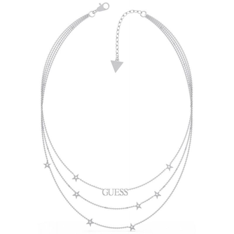 Naszyjnik z logiem Guess wykonany z stali nierdzewnej. Naszyjnik złożony z kilku łańcuszków zdobionych gwiazdkami z kryształkami Svarowskiego i logiem marki . Zapięcie na karabińczyk.