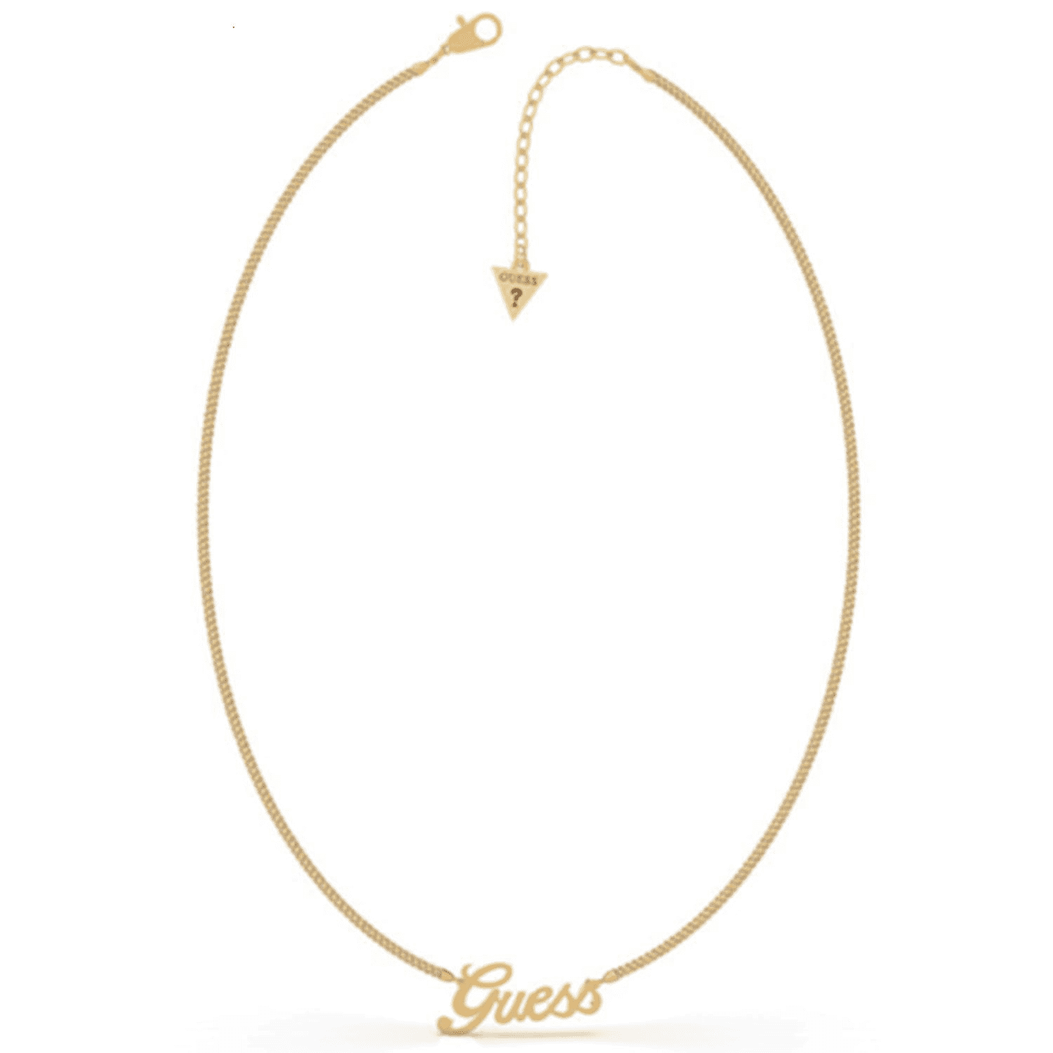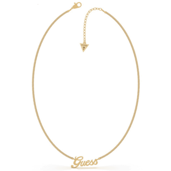 Naszyjnik z logiem Guess wykonany ze stali nierdzewnej platerowanej żółtym żłotem na łańcuszku wśród którego znajduje się napis “Guess”. Zapięcie na karabińczyk. Możliwość regulacji.