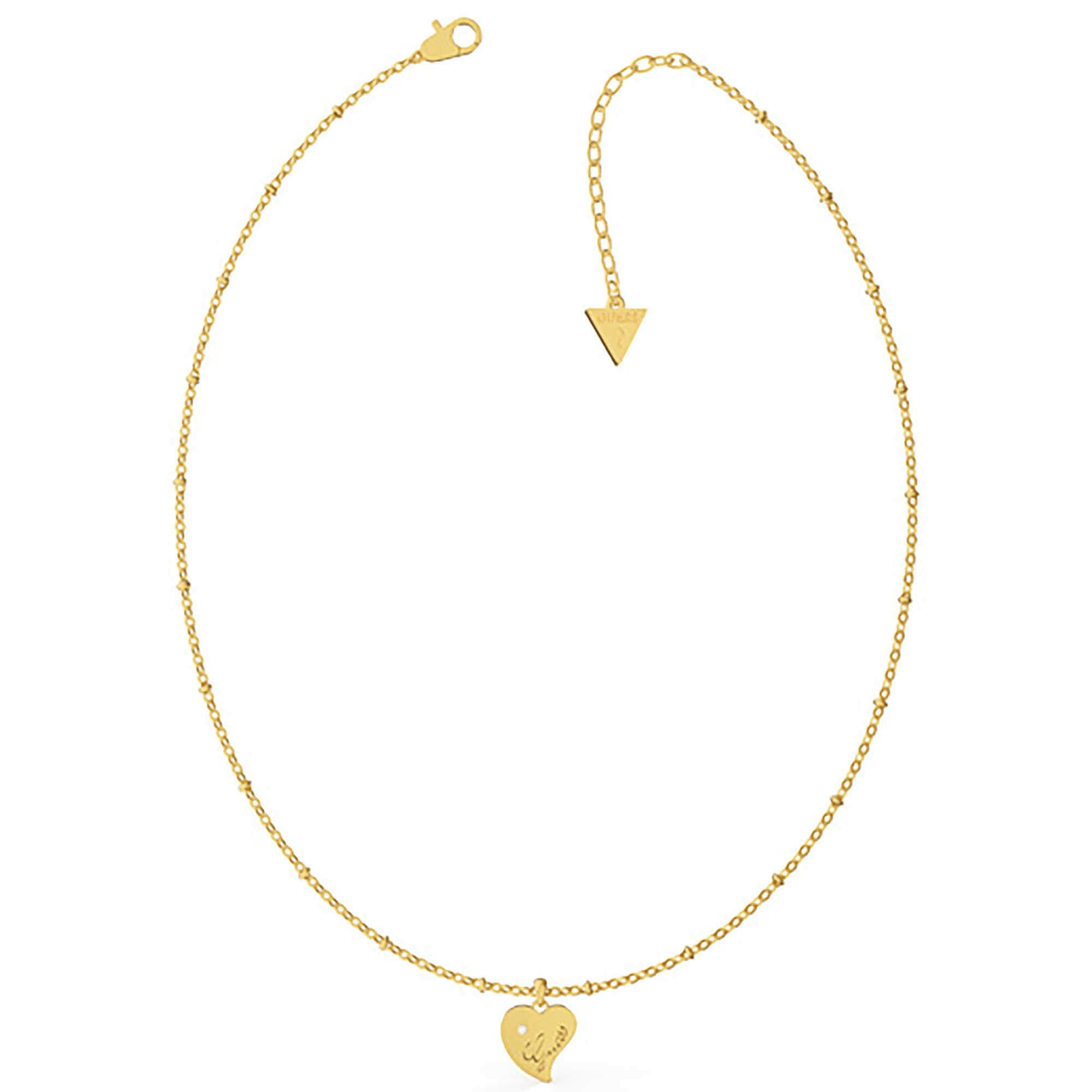 Naszyjnik z logiem Guess wykonany z platerowanej stali nierdzewnej na łańcuszku wśród którego znajduje się ozdobe serduszko z cyrkonią. Zapięcie na karabińczyk. Możliwość regulacji.