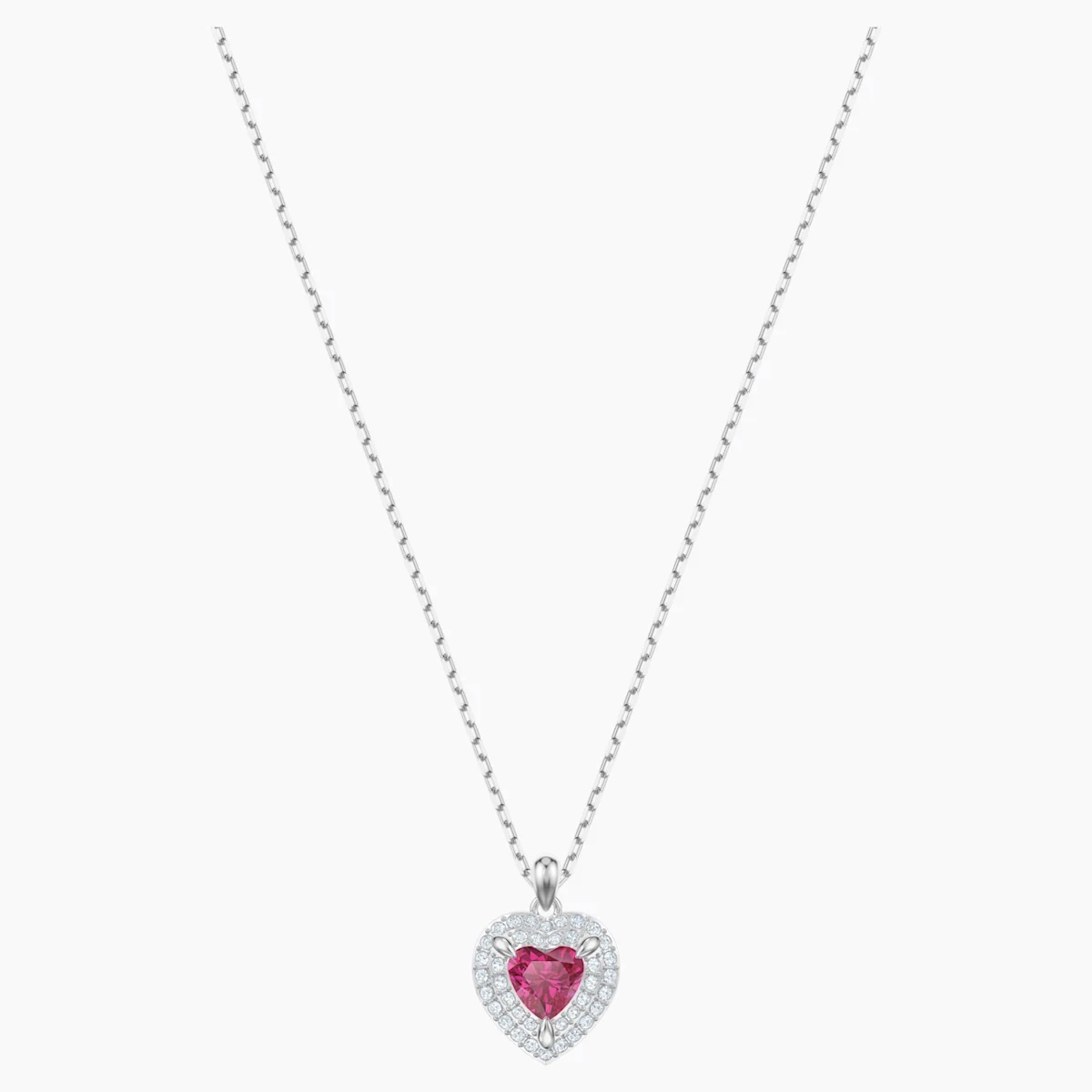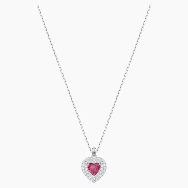 Naszyjnik będący symbolem miłości… Czerwony kryształ w kształcie serca, otoczony dwoma rzędami bezbarwnej kryształowej oprawy pavé. Ozdoba w ekscytujący sposób odbija światło. Połącz ją z pasującymi kolczykami sztyftowymi, aby dopełnić stylizację. Wisiorek w komplecie z łańcuszkiem.