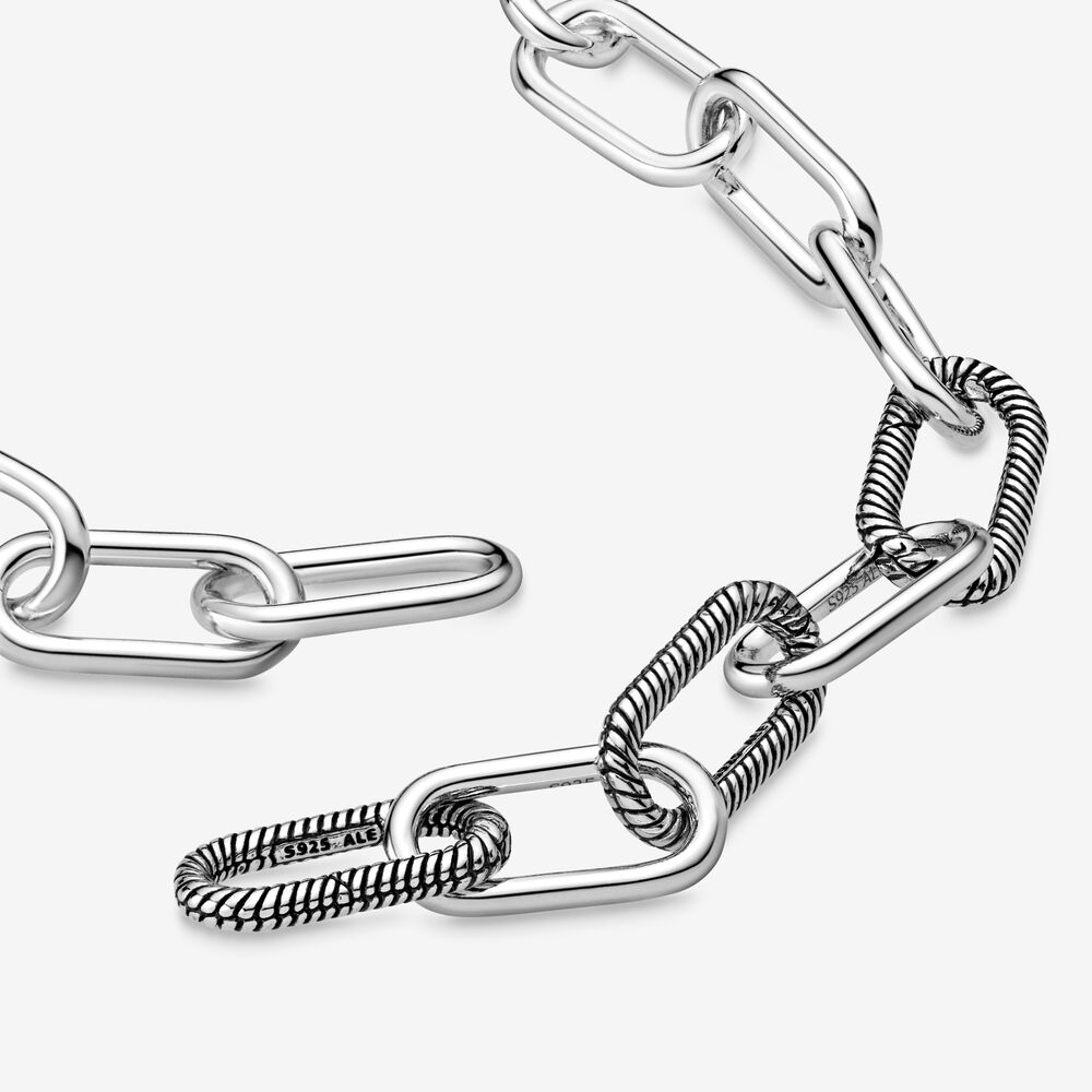 Załóż gruby naszyjnik Pandora Me z otwieranymi ogniwami i pokaż światu, co kochasz. Ma trzy ogniwa o fakturze splotu wężykowego, które możesz ozdabiać ulubionymi zawieszkami Pandora Me. Każdy z nich pomieści do 8 zawieszek Pandora Me. Srebrny wzór doda charakteru każdej stylizacji – noś i ozdabiaj go na różne sposoby, zależnie od nastroju.