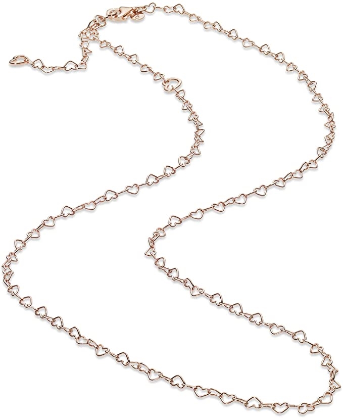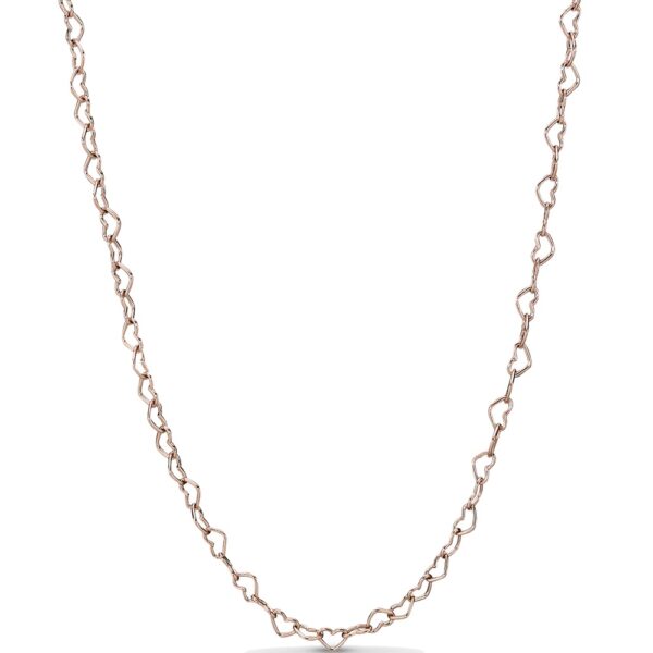 Klasyczny naszyjnik łańcuszkowy wykonany z polerowanego, unikalnego stopu metali Pandora Rose platerowanego 14-karatowym różowym złotem, został wzbogacony uroczymi sercami. Łańcuszek składa się z ikonicznych serc połączonych na całej jego długości, aby złożyć hołd wszystkiemu i wszystkim, których kochasz w swoim życiu. Można regulować go do trzech długości, aby zapewnić perfekcyjne dopasowanie – 50 cm, 55 cm i 60 cm. Wedle uznania możesz nosić go z wisiorkami lub bez.