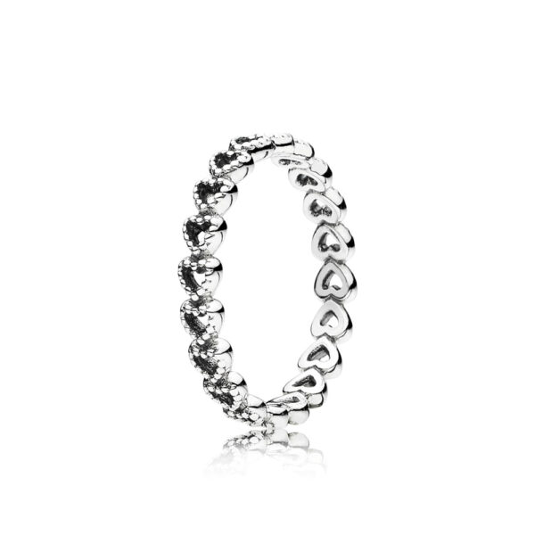 Cudowny ażurowy pierścionek, doskonały aby okazać gorące uczucie. Kunsztownie wykonany ze srebra próby 925, delikatny motyw otaczających palec ażurowych, wykończonych ręcznie serc. Romantyczny wzór, równie pięknie prezentujący się sam, jak i w połączeniu z innymi, kontrastującymi pierścionkami Pandora.