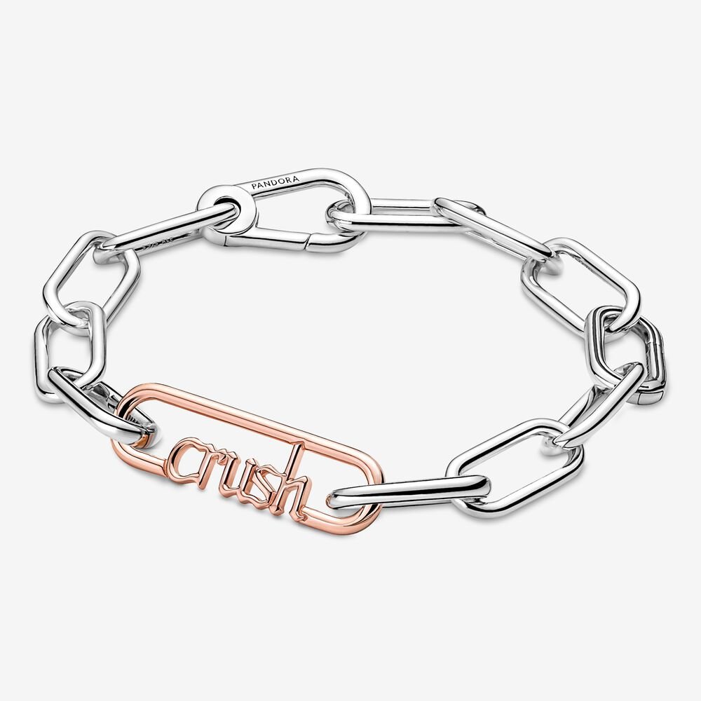 Miej przy sobie symbol swojego zakochania dzięki ozdobnemu ogniwu Pandora ME Crush. Ręcznie wykończone, wykonane z metalu platerowanego 14-karatowym różowym złotem ogniwo ozdobione jest napisem „crush” wykonanym odręczną czcionką i może być noszone pomiędzy ozdobnymi łącznikami. Noś je, aby zawsze pamiętać o ukochanej osobie, najbliższym przyjacielu albo nawet o sobie samej. Dodaj znaczenia swoim stylizacjom, łącząc to ozdobne ogniwo z ogniwami na bransoletkach, naszyjnikach lub kolczykach kołach. Możesz nawet nadać mu bardziej osobisty charakter, dodając medalion. Wskazówka stylizacyjna: jedno ozdobne ogniwo ze słowem ma taką samą długość jak podwójne ogniwo lub cztery małe ogniwa bransoletki, co daje nieskończone możliwości kombinacji.